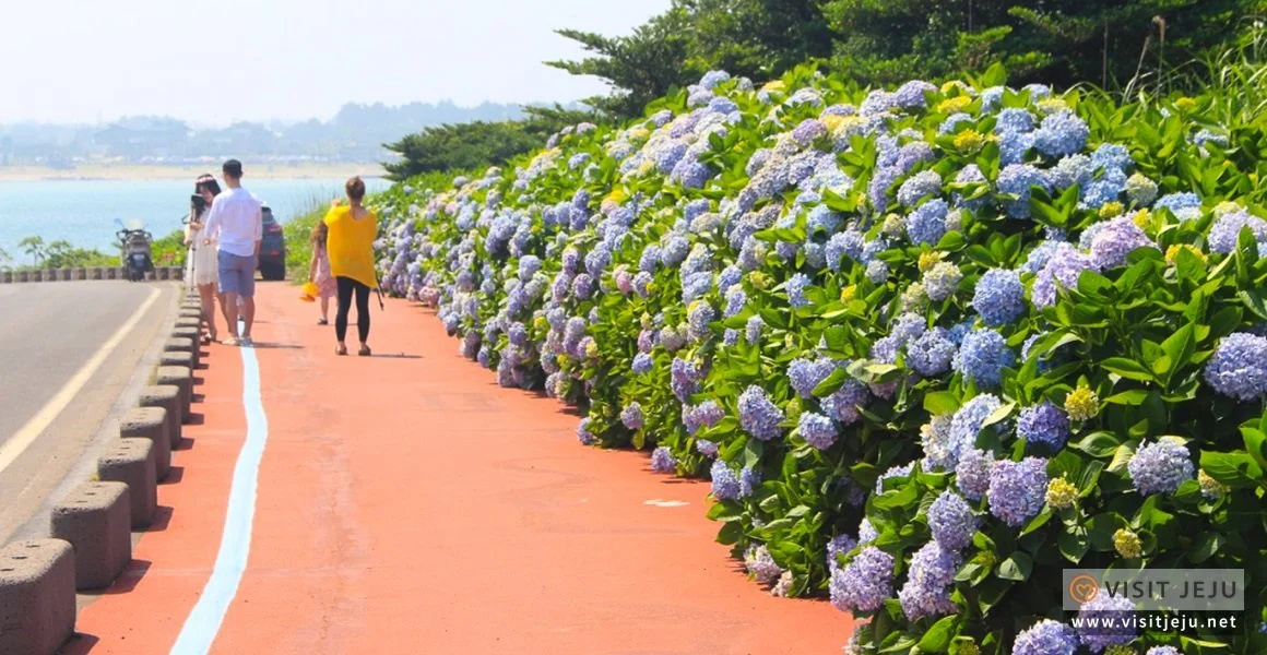 첫 번째로 소개할 제주 수국 명소는 ‘종달리 수국길’이다. 종달리 해안 도로를 따라 풍성히 피어난 수국을 감상할 수 있는데, 보통 6월 중순쯤 만개해 가장 아름다운 풍경을 자랑한다. 도로 바로 옆이라 차가 많으니 주변 차를 조심하며 구경해야 한다.