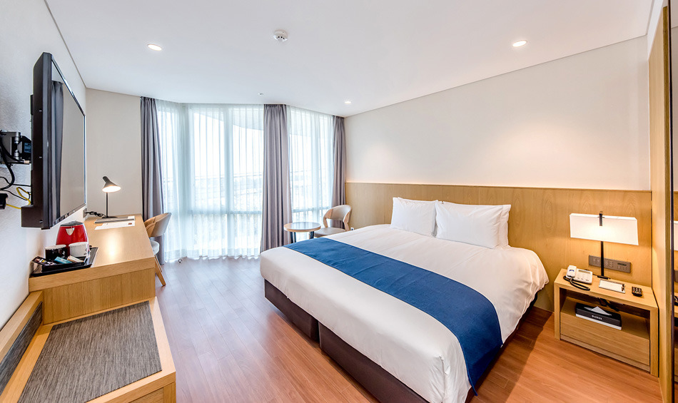 제주리젠트마린호텔은 합리적인 가격과 깨끗한 시설을 자랑하는 3.5성급 호텔로 여행 첫날, 혹은 마지막 날 머물기 좋은 합리적인 제주공항근처숙소 다. 슈페리어 더블룸은 포근한 분위기와 창문 너머로 보이는 푸른 오션뷰까지 편안한 휴식을 취하기에 제격이다..
