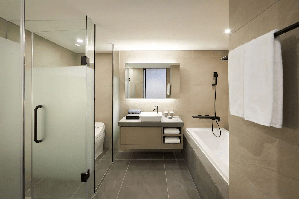 욕실 어메니티로 샴푸와 컨디셔너, 바디워시, 바디로션, 비누가 제공된다. 개인 위생 용품으로 칫솔과 치약, 샤워캡, 면봉, 화장솜, 바디 스펀지, 목욕 가운, 슬리퍼, 수건 등을 빠짐 없이 비치돼 있다.