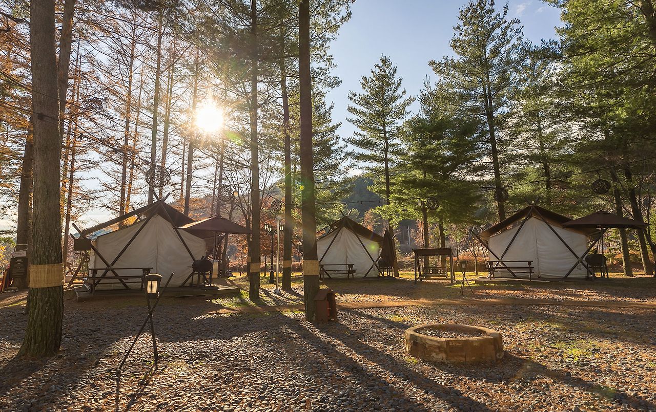 해발고도 700m의 전나무 숲과 아름다운 호수가 어우러진 청정 자연 속에서 글램핑도 즐길 수 있다. 럭셔리한 텐트와 침대형 소파, 냉장고 등 편의시설까지 모두 갖추고 있다.