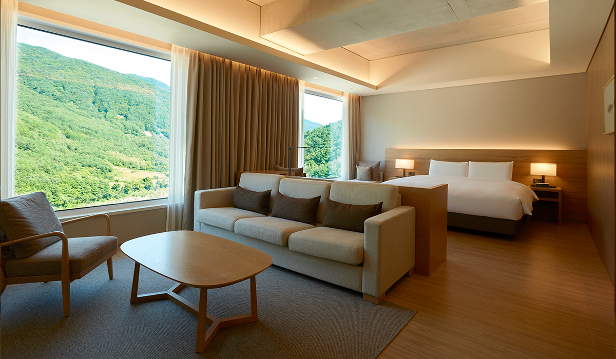 객실은 자연스러운 우드 계열의 가구를 비치했으며, 따듯한 색감의 조명을 사용해 편안한 분위기를 연출함과 동시에 창 밖의 마운틴 뷰와 잘 어우러져 보기만 해도 마음이 평온해질 거다.