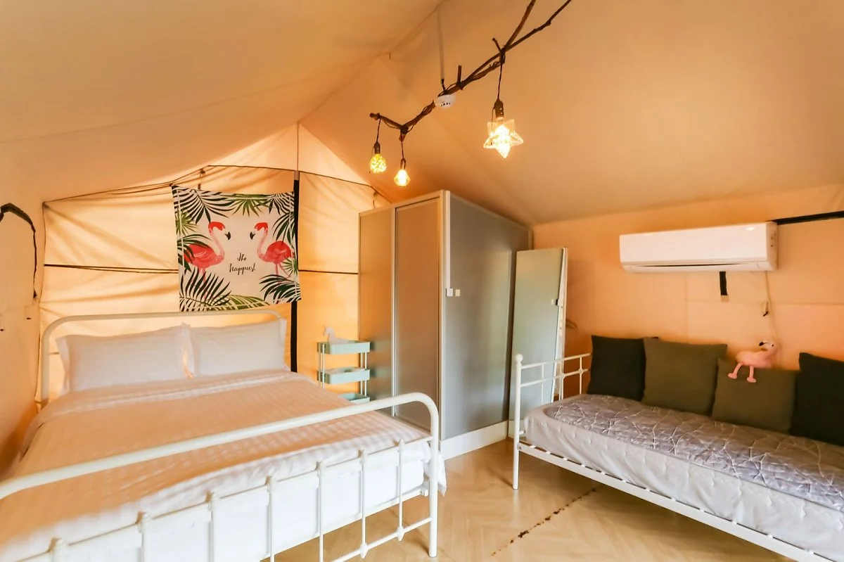 글램핑 객실은 위치에 따라 A~E동으로 나뉘는데 객실은 침실과 주방, 욕실, 개별 야외 테라스로 구성돼 있다. 내부에는 원목 침대와 TV, 소파, 좌식 테이블, 냉장고, 싱크대 등 필요한 모든 걸 갖추고 있다.