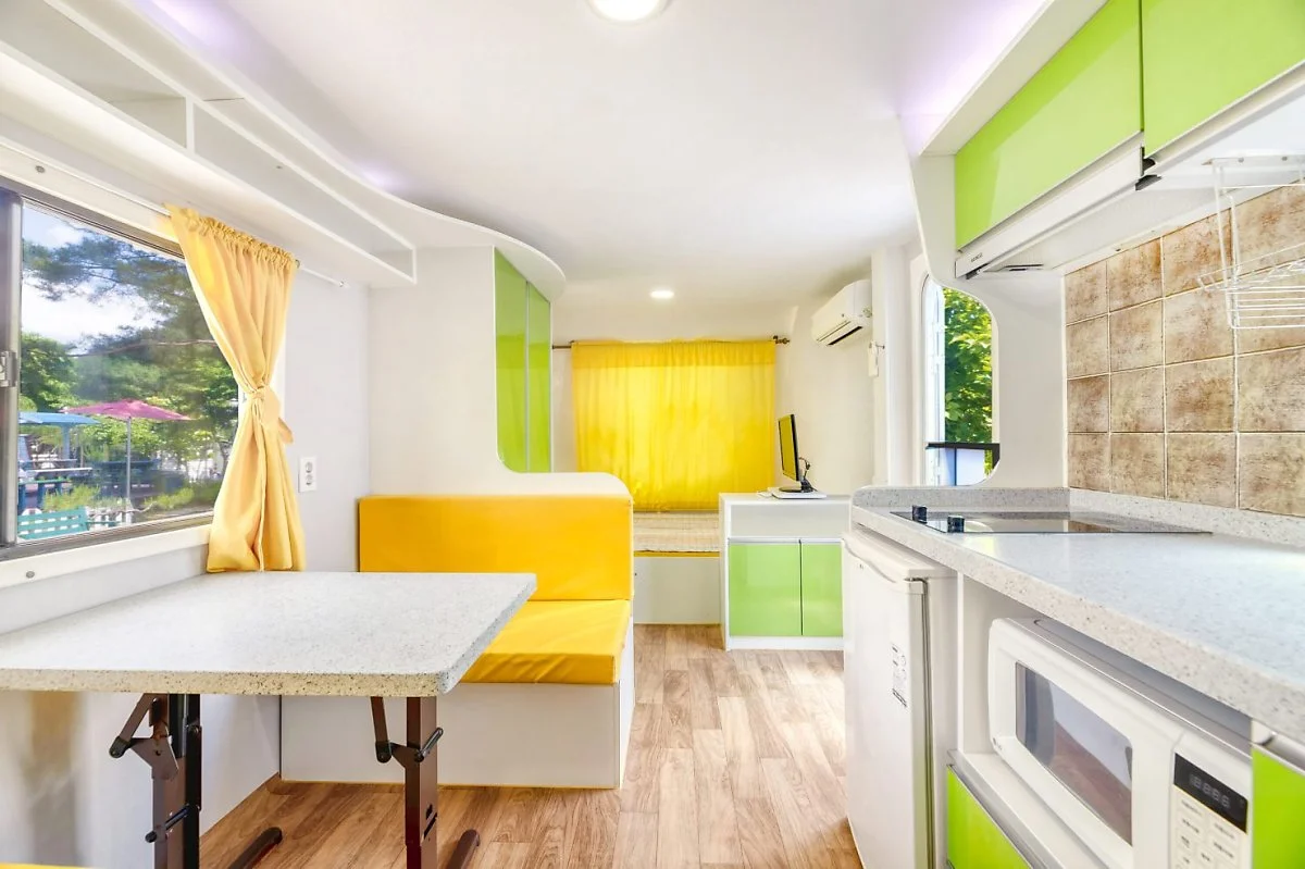 연인이라면 옐로우와 그린의 팝한 컬러감이 인상적인 카라반 9, 10호를 추천한다. 반면, 가족이라면 카라반 1~3호가 안성맞춤이다. 침실, 욕실, 주방과 함께 넓은 거실까지 갖추고 있다. 이외에도 숙소에는 수영장과 미니 골프장, 트램펄린 등이 마련돼 있다.