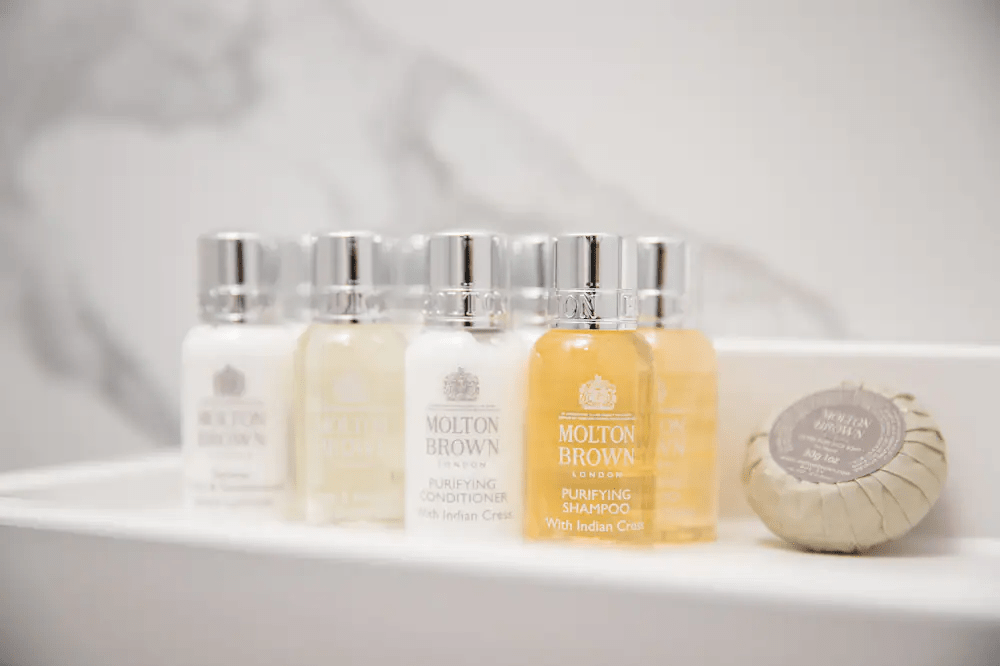 욕실에는 럭셔리 브랜드의 샴푸와 컨디셔너, 바디워시, 바디로션, 비누가 준비돼 있다. 칫솔과 치약, 빗, 샤워캡, 수건, 목욕 가운, 슬리퍼도 비치하고 있어서 편리하게 이용할 수 있다. 유아 동반 여행의 경우 유아 욕조를 무료로 대여할 수 있다.