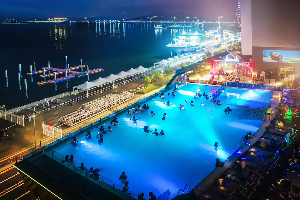 아무래도 여수 유탑마리나호텔 하면 인피니티 풀을 빼놓을 수 없다. 1, 2부로 나눠 운영되며 저녁 8시 이후에는 성인만 입장 가능하다. 기본 요금에 2만원을 추가하면 와인 3종을 무제한으로 즐길 수 있다.