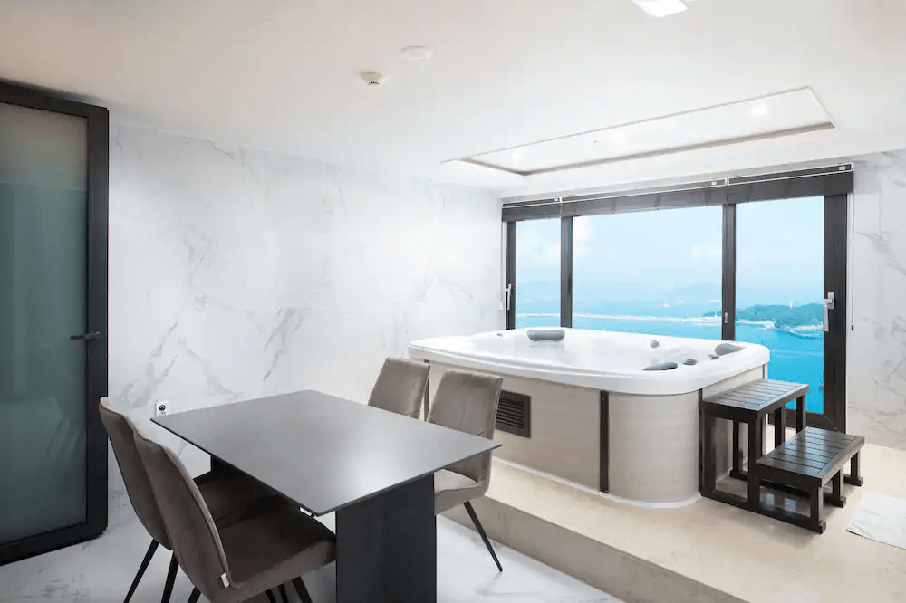 자쿠지는 저녁 9시까지 직원 방문 하에 담수 및 배수가 가능해요. 약 30분 정도 걸린다. 자쿠지 테라스에는 4인 식탁이 놓여 있다. 룸서비스와 함께 즐겨보면 어떨까? 야식 메뉴가 1~3만 원대로 합리적인 편이다.