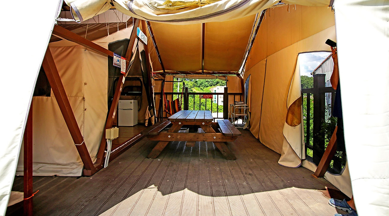 구름위산책은 모든 객실에 펜스가 설치되어 있고, 개별 테라스에는 바비큐 파티를 즐길 수 있는 테이블과 취사 시설이 마련되어 맛있는 식사를 즐기기에도 좋다. 그뿐만이 아니라 텐트 내부는 글램핑 객실이라곤 믿기지 않을 만큼, 깔끔하고 고급스러운 시설을 갖추고 있다. 따듯한 바닥 난방과 개별 욕실 그리고 포근한 침구까지 하루 제대로 쉬어갈 수 있다.
