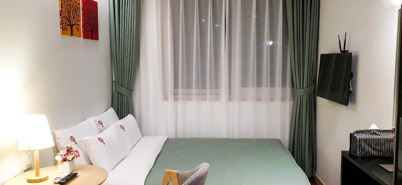 제주 스위스 마을 412동의 201호에는 널찍한 침대, 테이블과 의자, 옷장, 화장대, TV 등이 준비돼 있다. 그 외 전기 포트, 전자레인지, 컵 등이 알차게 준비돼 있다.