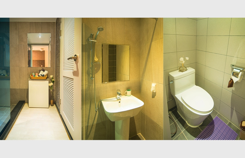 샤워부스와 화장실이 분리된 욕실로 편리하게 사용할 수 있다. 어메니티로는 비누, 샴푸, 바디워시, 샴푸 등 모두 제주담에서 직접 만든 천연 제품으로 준비된다. 그뿐만이 아니라 수건과 헤어드라이어도 갖추어져 여행 짐 가볍게 챙겨와도 된다.