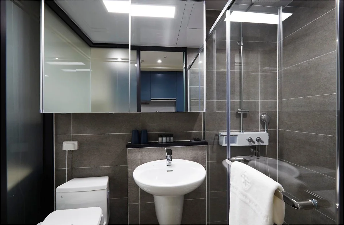 어메니티는 샴푸, 린스, 바디워시, 바디로션, 칫솔 세트, 면도기 등이 꼼꼼히 구비되어 있다.