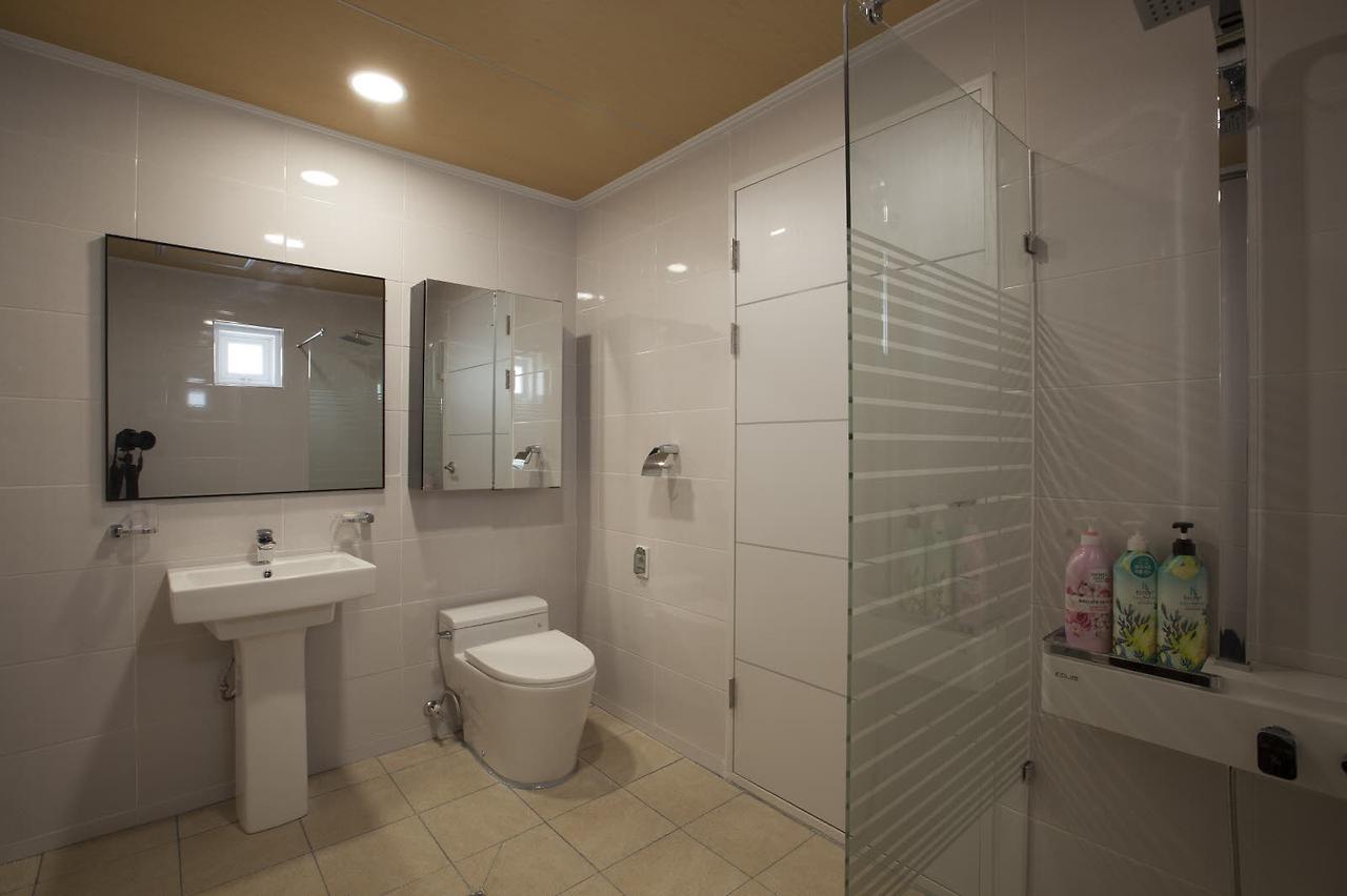 욕실에는 샤워부스가 설치돼 있고, 굉장히 널찍한 편이다. 어메니티로는 샴푸, 린스, 바디워시 등이 대형 사이즈로 갖추어져 있고, 그 외 비누, 헤어 드라이어 등이 제공된다.