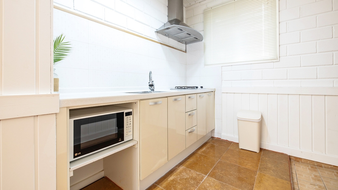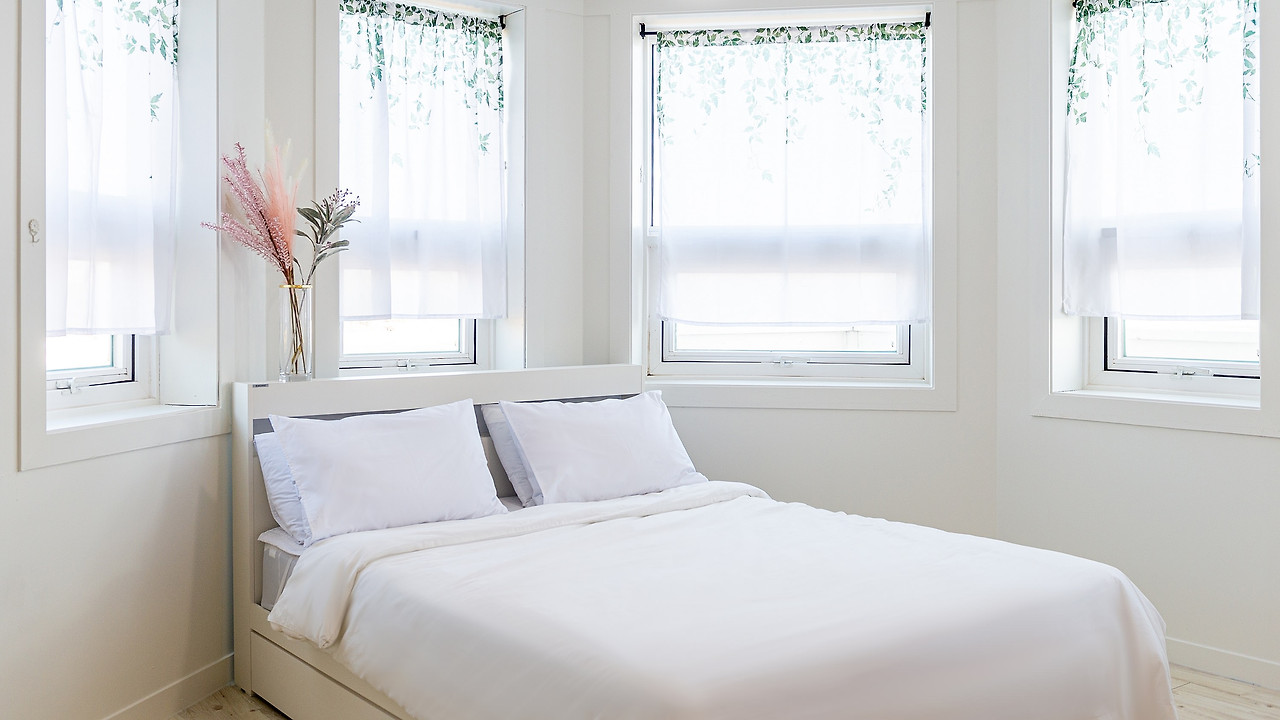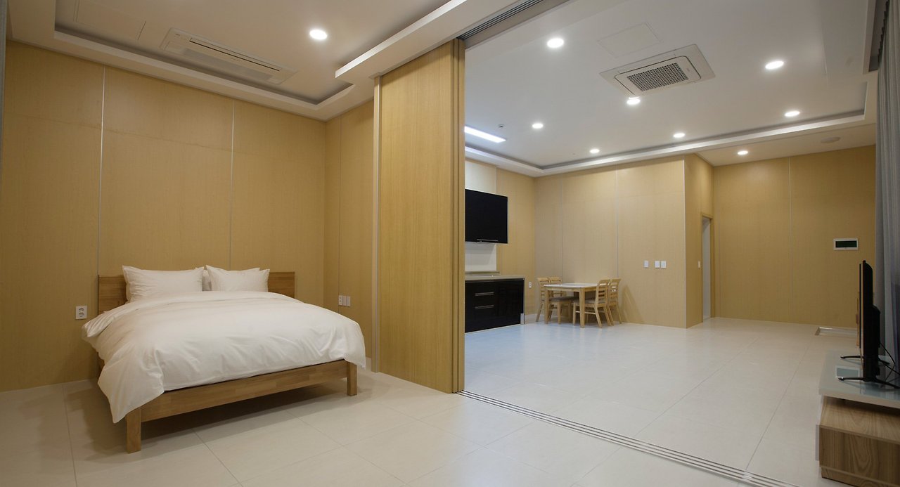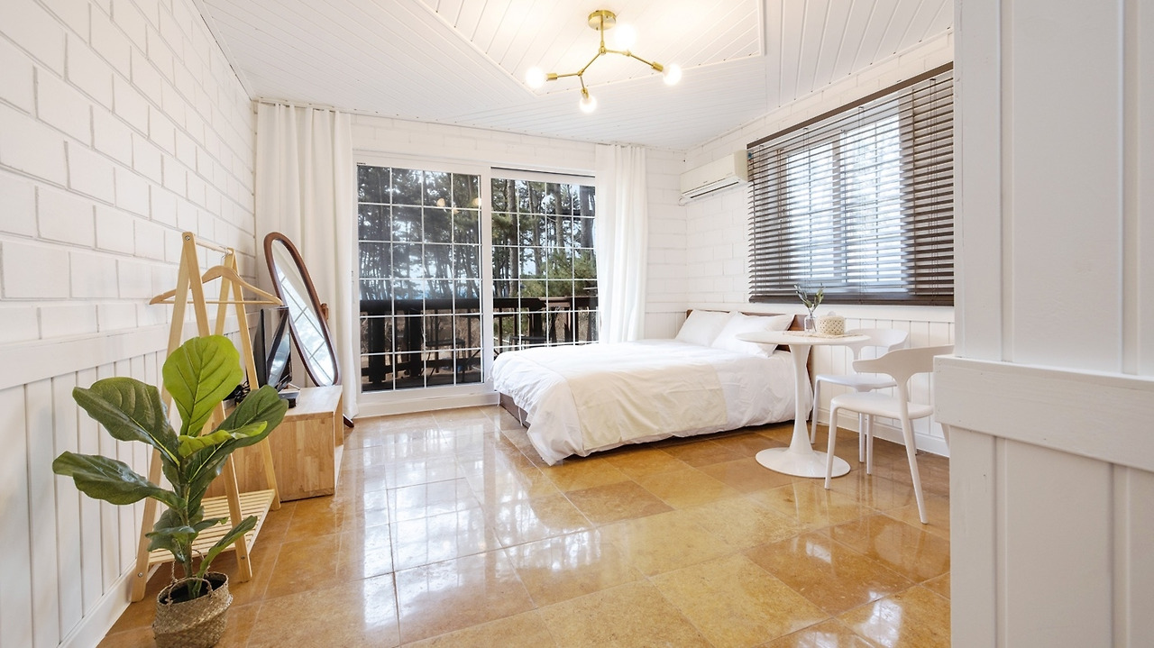 내부 역시 깔끔하고 감성적으로 꾸며져 있다. 객실에는 퀸사이즈 침대와 TV, 테이블과 의자, 그리고 취사도구가 갖추어진 주방도 있다.