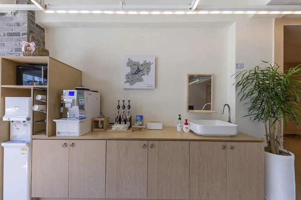로비에는 전자레인지와 정수기, 커피 머신이 갖춰져 있어요. 입·퇴실 전후로 커피 한 잔의 여유를 즐길 수 있다. 1층 비즈니스 센터에는 컴퓨터와 스타일러, 세탁기를 비치돼 있으니, 투숙 기간 동안 편히 사용할 수도 있다.