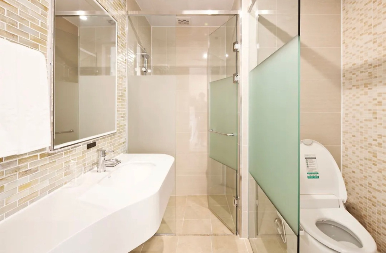 욕실은 샤워부스가 설치돼 있다. 어메니티로는 샴푸, 헤어 컨디셔너, 바디워시, 바디로션, 수건, 드라이기 등이 준비돼요. 칫솔, 치약, 면도기, 클렌징폼은 개별적으로 챙겨와야 한다.
