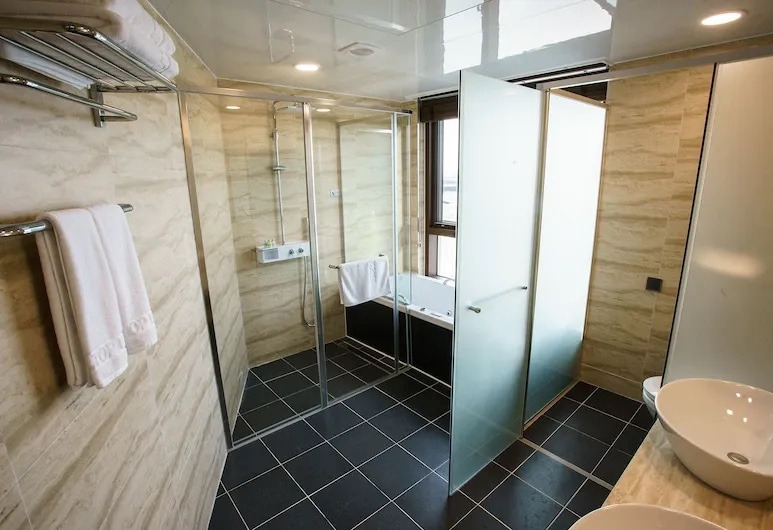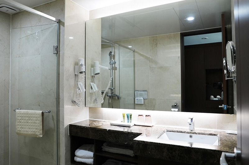 욕실에는 샤워부스가 설치돼 있고, 어메니티로는 샴푸, 린스, 바디워시, 바디로션, 비누, 수건과 헤어드라이기, 욕실 가운 등이 준비된다. 칫솔과 세안제는 개별적으로 챙겨와야 한다.