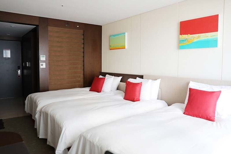 라마다 제주 함덕의 트리플 룸은 싱글 베드가 3개 놓여 있어 형제, 자매 여행에 활용도가 높은 객실로 인기가 높다. 객실에는 TV와 책상 겸 화장대, 의자, 조명, 개인금고, 미니 냉장고 등 가성비 객실이지만 알차게 구성돼 있다. 전망은 마운틴뷰 또는 시티뷰 가운데 선택 가능하다.