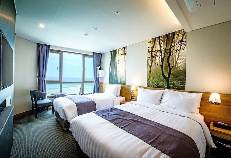 가족과 함께 머물기 좋은 제주 함덕 숙소 유탑유블레스의 디럭스 트윈룸은 제주 동쪽 탁 트인 바다가 한눈에 내려다 보이고, 더블베드와 싱글베드가 놓여 있어 최대 3인까지 머물 수 있다. 36개월 미만 아이들은 추가금 없이 이용할 수 있는데, 그뿐만이 아니라 베이비 가드와 베이비 욕조도 무료로 대여 가능하다.