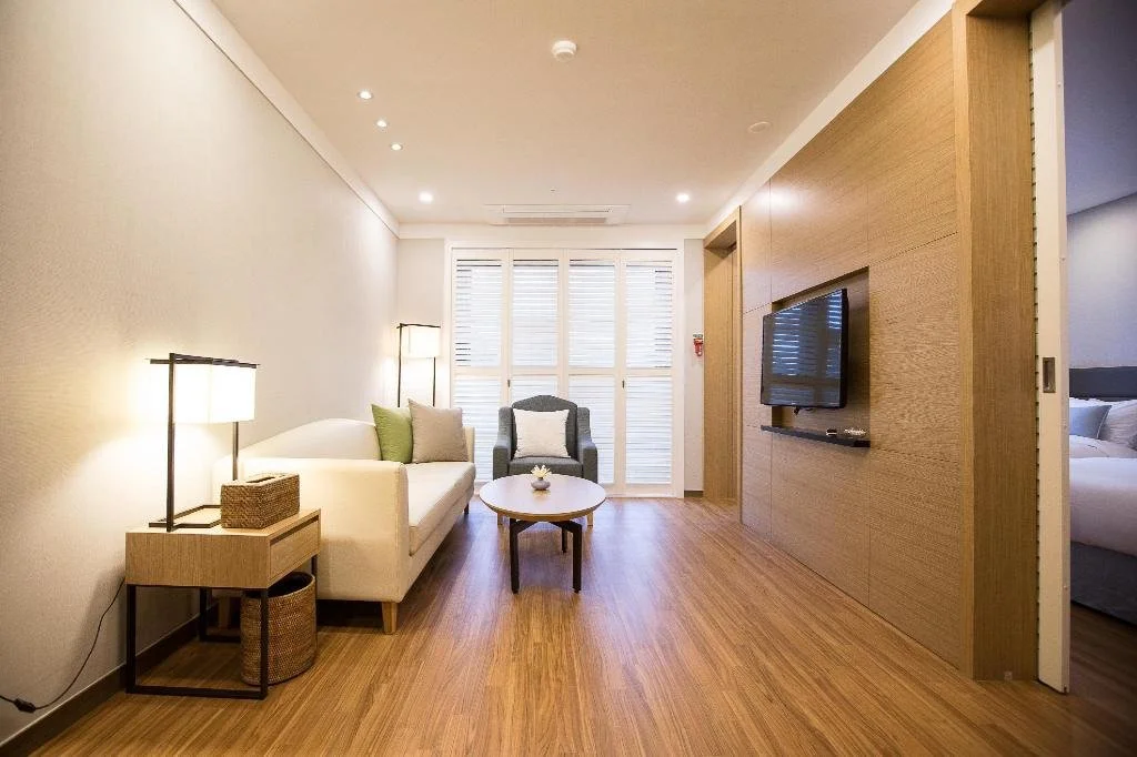 제주 마레보리조트의 주니어 스위트룸은 침실과 거실이 분리된 구조로 공간이 분리되어 좀 더 쾌적하게 머무를 수 있다. 전망은 바다(수영장)와 산 중에 선택할 수 있다.
