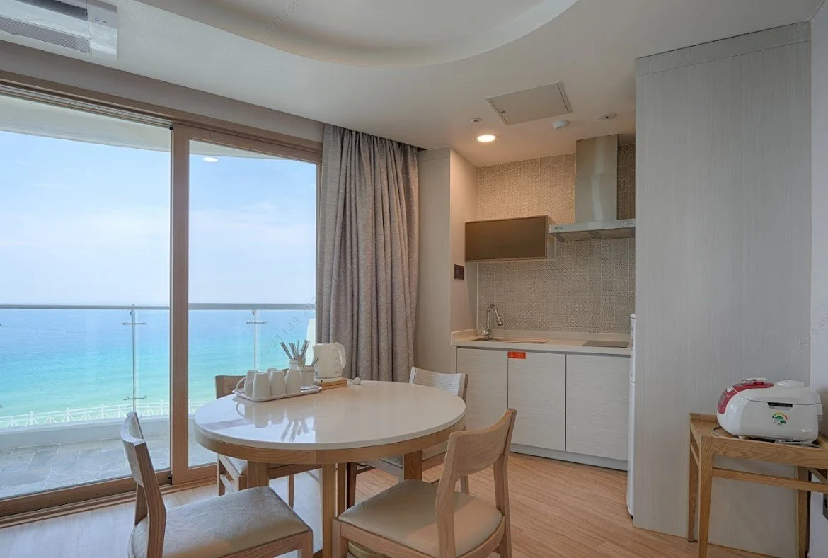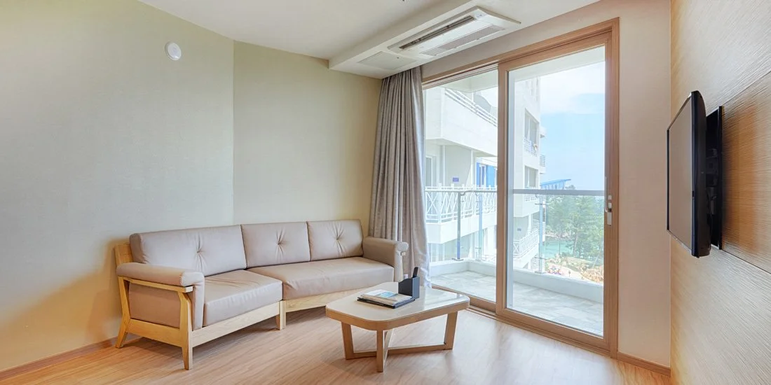 삼척 쏠비치 리조트의 스위트 테라스 객실은 광장뷰와 오션뷰를 모두 즐길 수 있는 객실이다. 거실과 침실(더블베드+온돌 룸) 2개로 구성되어 있으며, 최대 5인까지 숙박이 가능해 가족 여행 숙소로도 딱 맞다.