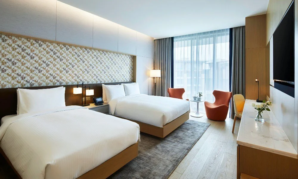 랜딩관 패밀리 트윈 룸은 제주 신화월드 서머셋 만큼 가족 여행자에게 사랑 받는다. 객실에는 퀸과 싱글 베드, 화장대, 소파, 테이블을 갖췄고. 스마트 컨트롤 시스템으로 조명과 온도를 조절할 수 있다.