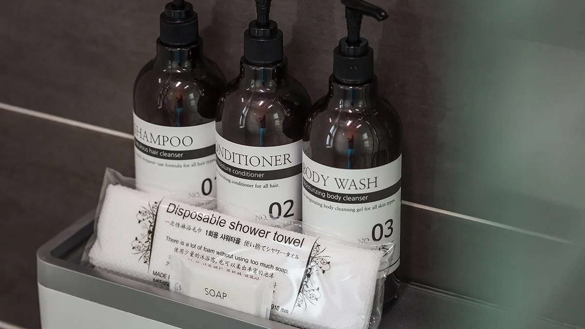 욕실에는 샴푸와 컨디셔너, 바디워시, 비누, 치약이 제공된다. 수건과 드라이기도 비치돼 있지만, 개인 위생 용품인 칫솔과 면도기, 세안제는 따로 준비해 와야 한다.