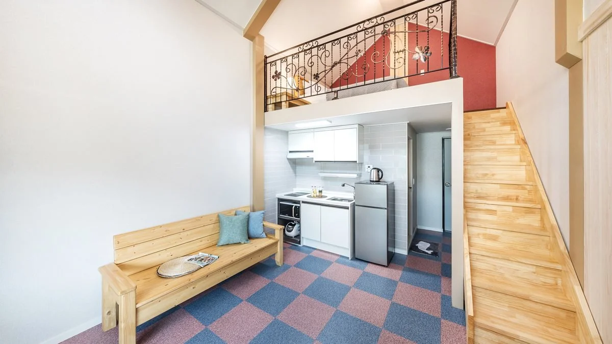 연인과 가족에게 두루 추천하는 하동 숙소 자연애가펜션 대표 객실이다. 복층형 구조로 침실과 거실 겸 주방, 욕실로 구성됐다. 넓은 야외 데크로 나서면, 계곡이 한눈에 들어 오는데. 전체 10평 규모로 여유로운 편이다.