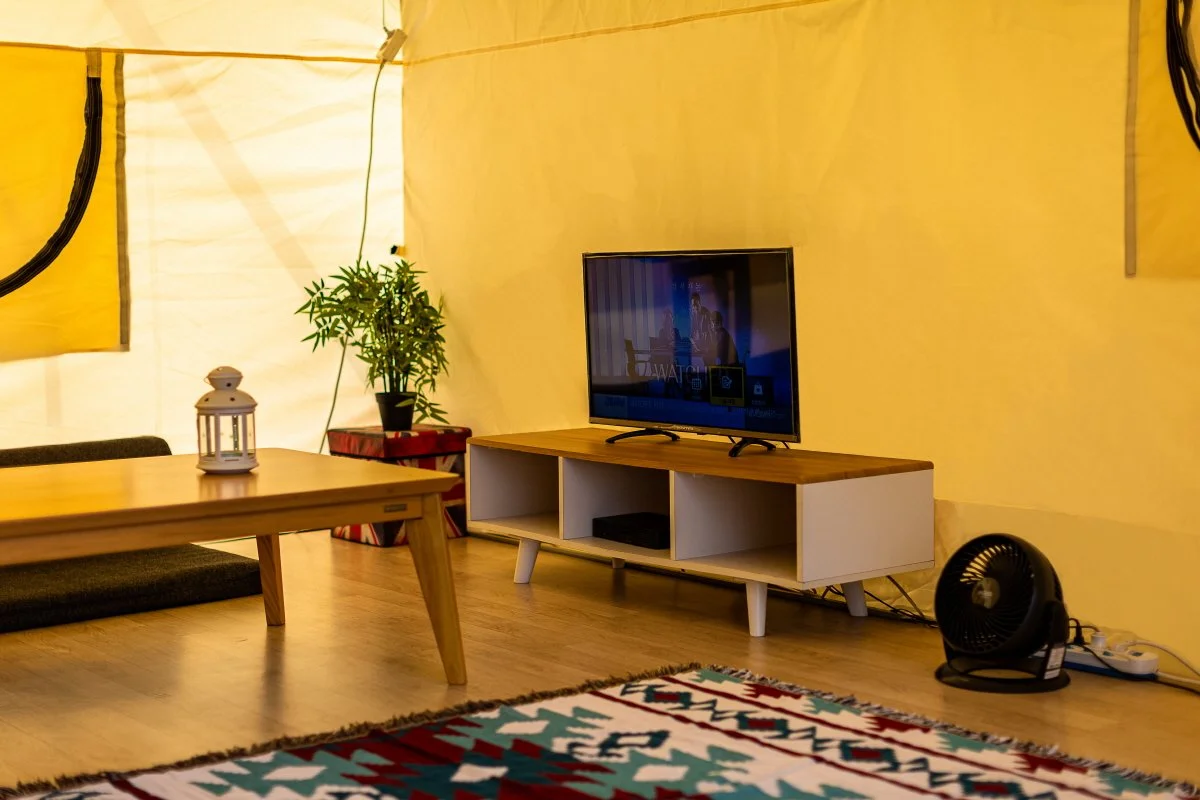 감성 글램핑 A는 감각적인 소품들이 가득하다. 성인 4명까지 투숙이 가능할 정도로 면적도 넉넉한데, 침구류는 매일 세탁해 비치하기 때문에 쾌적하게 지낼 수 있다. 가스버너, 냄비, 코펠세트 등 취사도구도 모두 준비되어 있다.