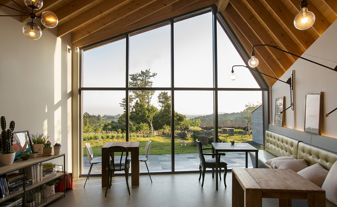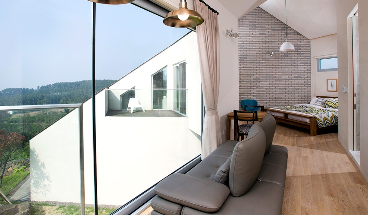 객실 내부도 업사이클링 가구로 꾸며져 있으며, 2면이 통창으로 이루어져 있어 제주의 서쪽 풍경을 배경으로 인생 사진을 남기기에 제격인 곳이다.