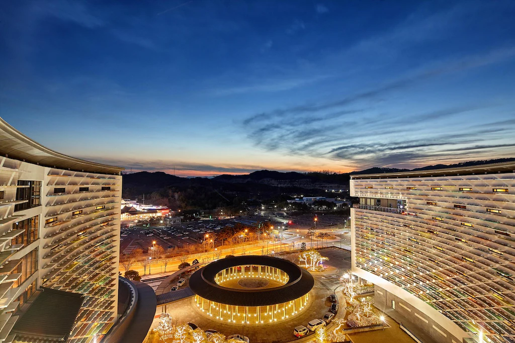 리조트는 화려하고 동시에 단아한 백제의 아름다움을 고스란히 담아냈다. 알록달록한 컬러와 우리 전통 기와의 조화가 인상적이다. 객실은 가림과 열림의 공간미를 지닌 대청마루 중첩 구조로 아늑하게 꾸며 놨다.