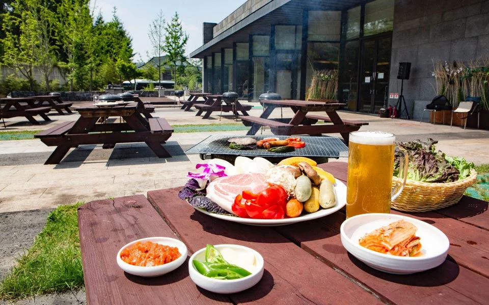 야외 레스토랑 정경마당에서는 셀프 BBQ(바비큐)를 즐길 수 있다. 오후 6시부터 9시까지 이용 가능하다. 테이블과 그릴 대여료는 비수기 기준 5만 원이다. 간단한 식재료와 소모품도 판매하나, 미리 장 봐오는 걸 추천한다.