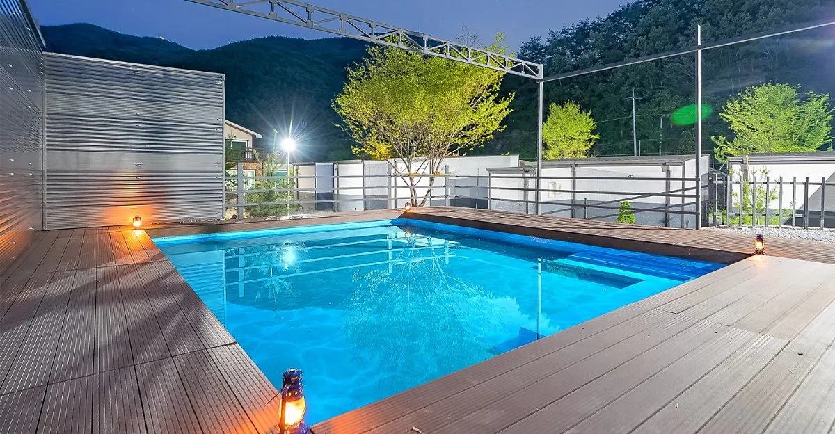 하절기에는 야외 수영장을 운영되는데, 단양 펜션 바로 앞에 계곡도 있어 물놀이하기 좋다.