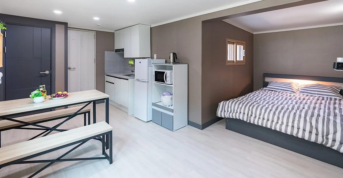 체크인은 15시부터 가능하며 체크아웃은 11시까지 마무리하면 된다. 카페 겸 휴게 공간이 있어 편안한 시간을 보낼 수 있다.
