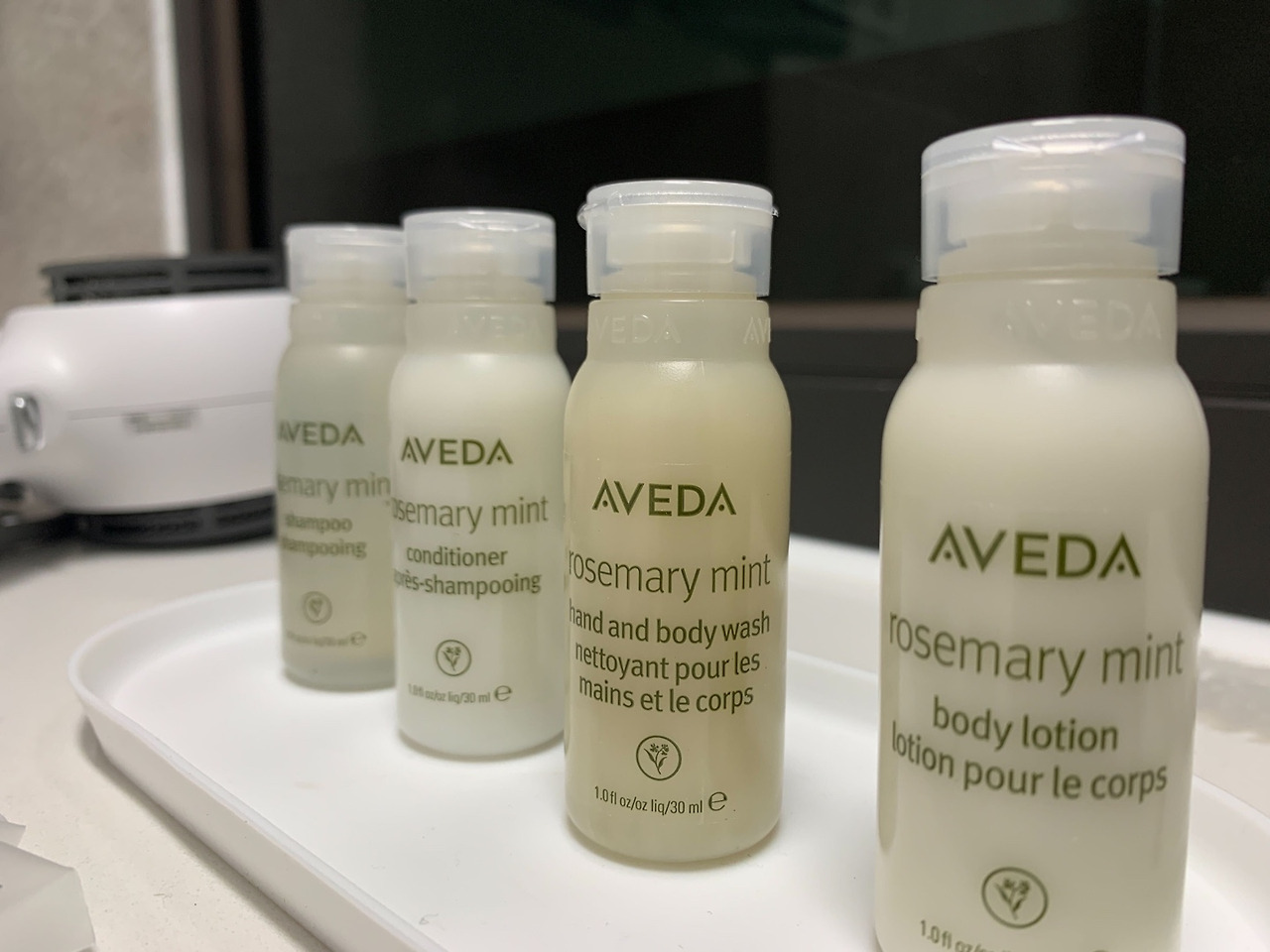 욕실은 샤워부스와 세면대가 나뉘어 있다. 어메니티는 아베다 제품으로 샴푸, 컨디셔너, 핸드&바디워시, 바디로션, 치약&칫솔, 비누, 드라이기, 수건도 8장이나 준비된다.