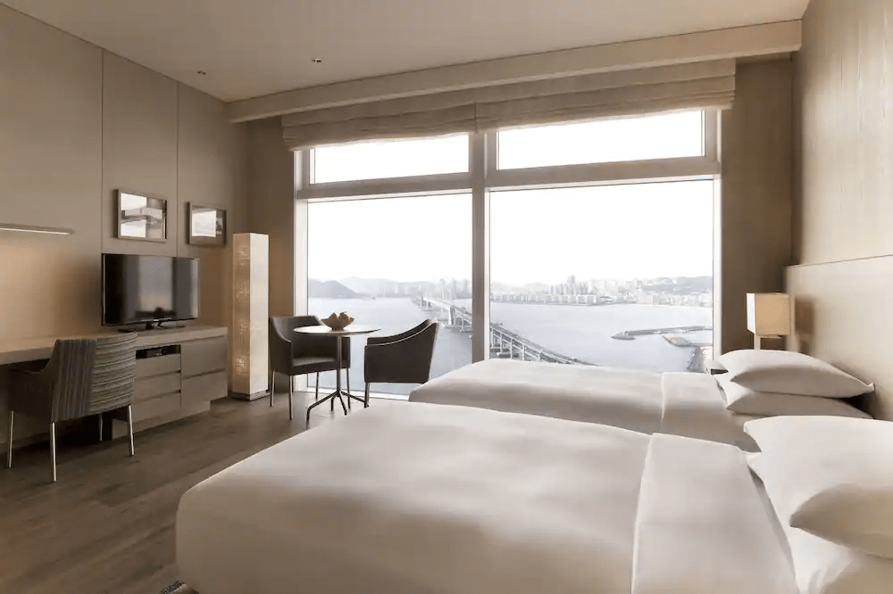 호텔은 부산의 새로운 랜드마크인 해운대 마린시티에 자리했다. 5성급 호텔답게, 화려한 외관만큼이나 실내도 베이지 톤의 목재 인테리어로 고급스럽게 꾸며져 있다. 객실에서는 바다는 물론, 광안대교까지 내려다 보인다.