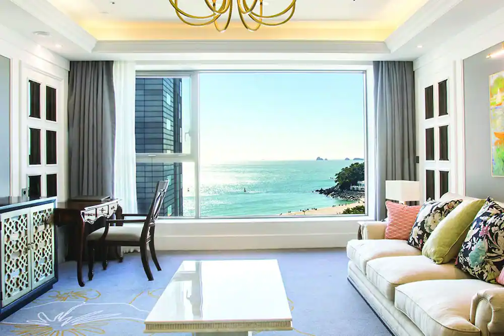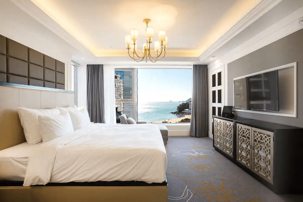 고층에 위치한 해운대 베이몬드호텔 대표 오션뷰 객실로 라지 킹 베드와 소파, 업무용 데스크, 전기 포트, 간이 조명, 개인 금고, 기가 지니 등을 구비했어요. 최대 3명까지 투숙 가능하다.