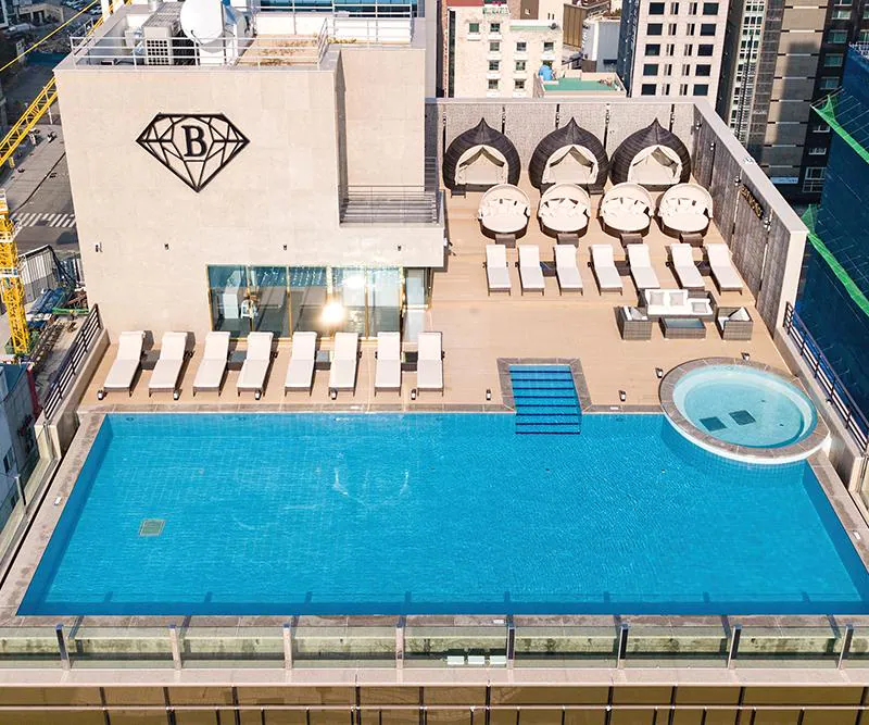 루프탑 수영장은 오직 해운대 베이몬드호텔 투숙객만 이용 가능하고 입장료도 없다. 운영 시간도 오전 8시부터 밤 11시까지 넉넉하다. 저녁 8시부터는 노 키즈존으로 운영되는데, 낮과는 완전히 다른 분위기로 즐길 수 있다.