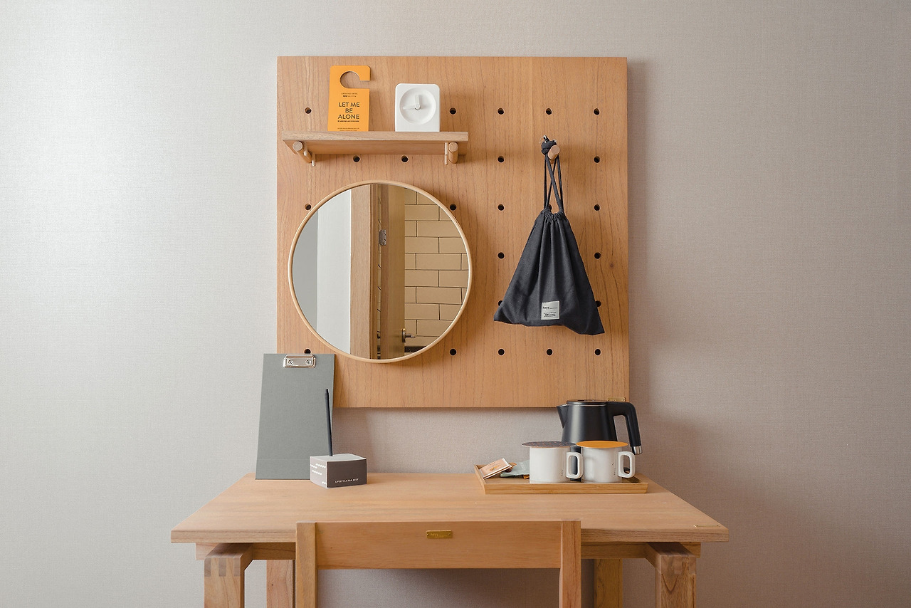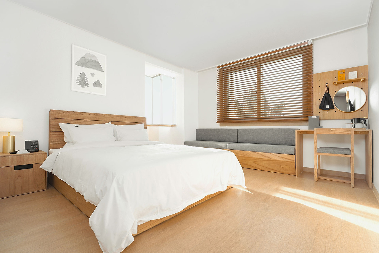 제주도 헤이 서귀포 호텔의 객실은 감성적이도 편안한 느낌을 주는 우드톤으로 인테리어 되어 있다. 이코노미 더블룸은 혼캉스 여행을 준비하는 분도 부담 없는 객실로 성수기 1박 기준 4만 원대로 가성비를 자랑한다.