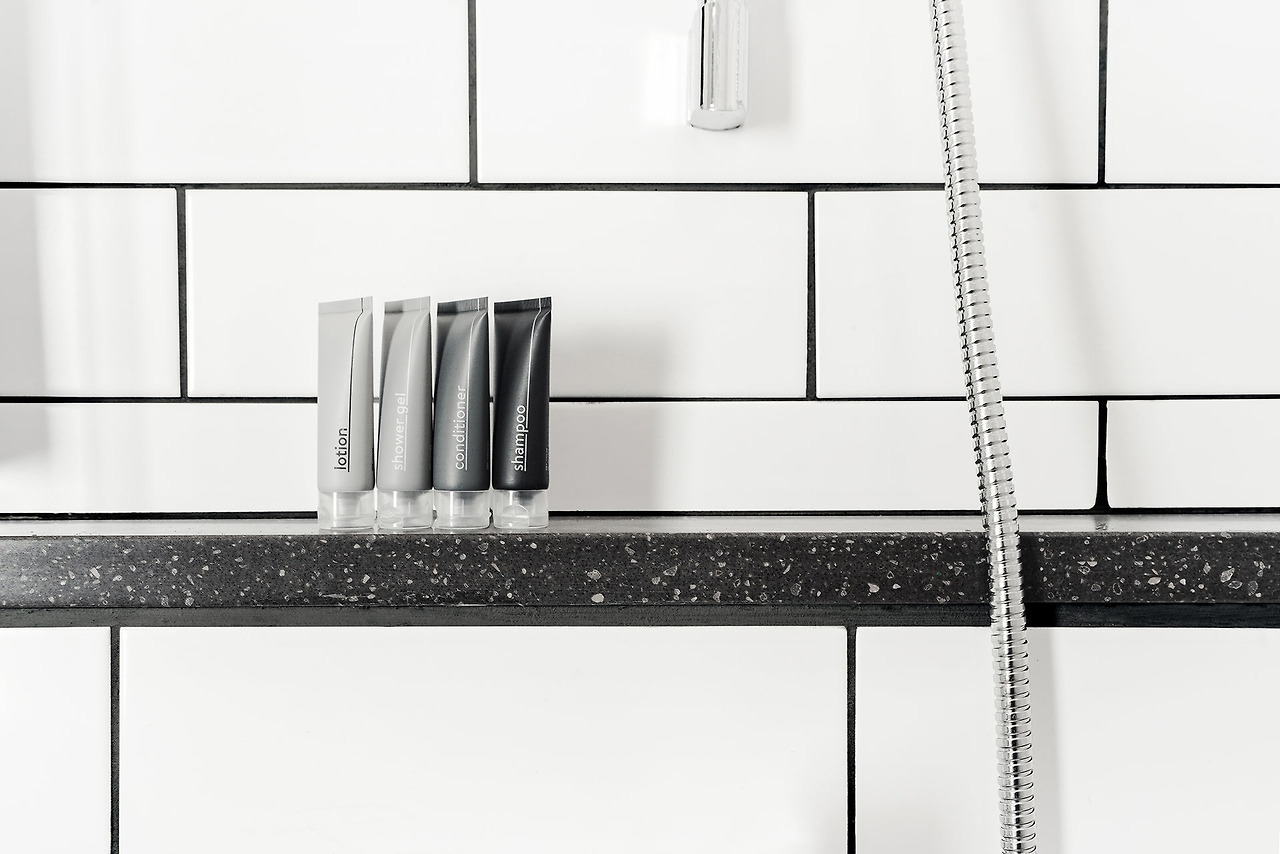 욕실도 화이트 톤으로 샤워부스가 설치되어 있으며, 어메니티는 헤이 서귀포 자체 제품으로 샴푸, 린스, 바디워시, 바디로션 등이 제공된다. 그 밖에 치약과 칫솔, 바디 스펀지, 수건 등도 준비된다.