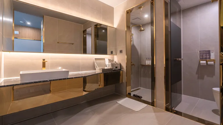 욕실은 널찍한 세면대가 있고 변기와 샤워부스가 각자 분리된 구조이다. 어메니티로 샴푸와 린스, 바디워시는 리필형으로 준비되며, 그밖에 치약, 칫솔, 면도기, 머리끈, 면봉 등 일회용품도 아낌없이 갖췄다.
