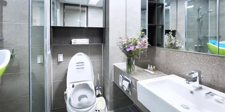 욕실에는 샤워부스가 설치되어 있고, 어메니티로는 샴푸, 린스, 바디워시가 리필형으로 제공된다. 그밖에 치약, 칫솔 등 일회용품은 준비되지 않으니 개별적으로 챙겨와야 한다. 깜빡하신 분은 1층 편의점에서 구매하면 된다! 아기 욕조와 변기 시트도 상시 비치되어 있다.
