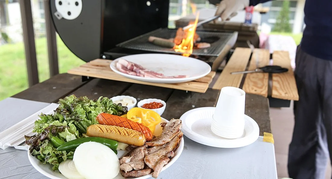 물놀이 후엔 고기! 탁 트인 야외에서 셀프 바비큐도 즐길 수 있다. 3부제로 운영되며 애견 동반 가능한 공간도 있다. 그 외에도 다양한 식음시설과 코인세탁실, 오락실 등이 있어 지루할 틈이 없다.