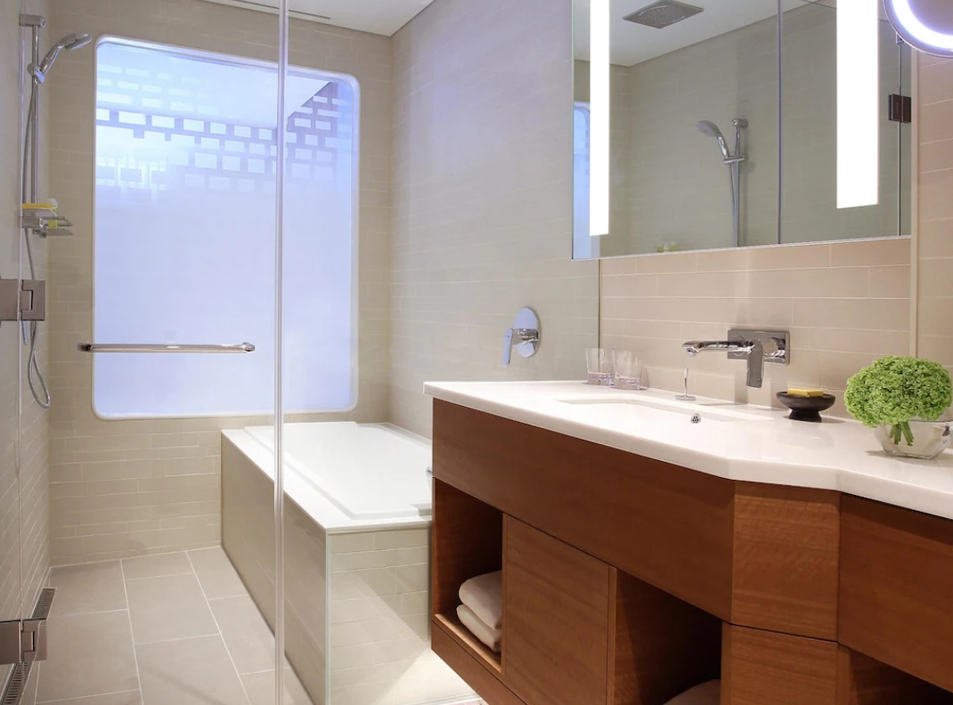 욕실에는 널찍한 세면대와 욕조가 설치되어 있다. 어메니티로는 펜할리곤스 제품으로 샴푸, 헤어컨디셔너, 샤워젤, 치약, 칫솔, 면봉, 목욕 가운, 수건, 헤어드라이어, 슬리퍼 등이 갖춰져 있다.