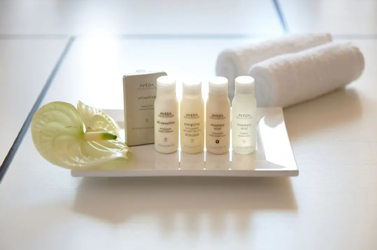 욕실에는 아베다의 제품으로 채워져 있다. 이와 함께, 칫솔과 치약, 머리빗, 면봉, 화장솜, 헤어드라이어, 수건, 목욕 가운 등을 비치해 놨다. 그러므로 세안제 정도만 챙겨 와도 될 거다.