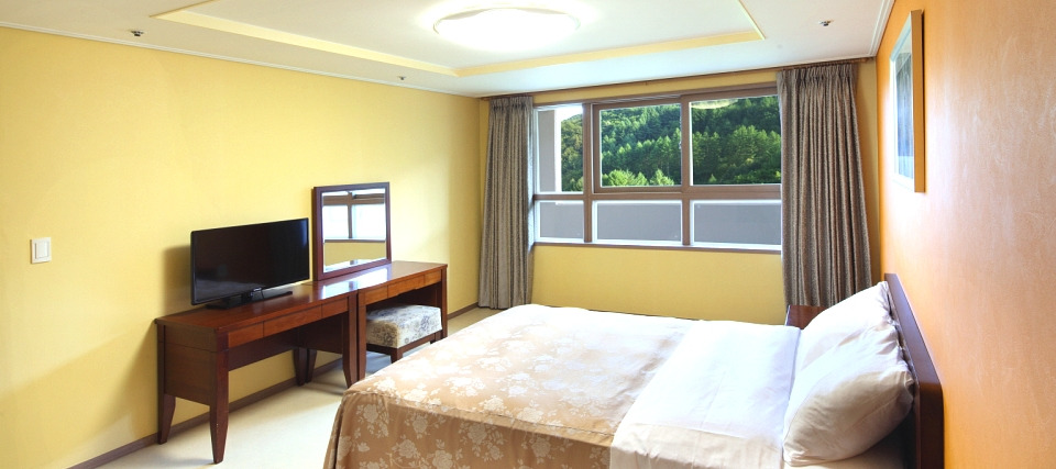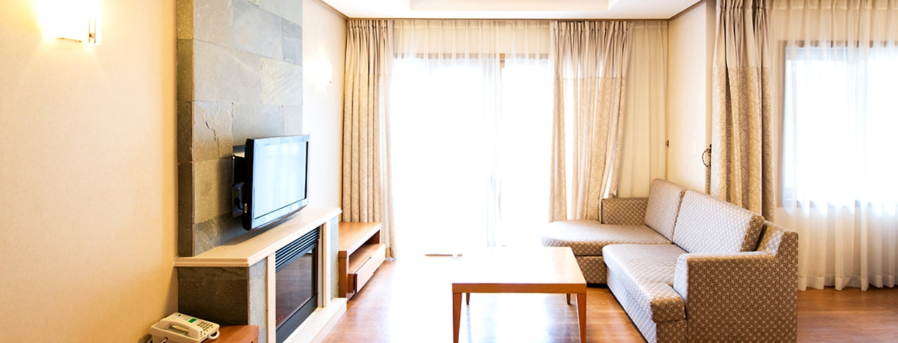 평창 리조트 휘닉스의 스탠다드 룸은 거실 겸 주방 그리고 침실로 구성돼 있는데, 객실 어디서나 편안하게 마운틴뷰도 즐길 수 있고 최근 리모델링으로 가장 쾌적한 컨디션을 자랑해 가장 인기 있는 객실이다.