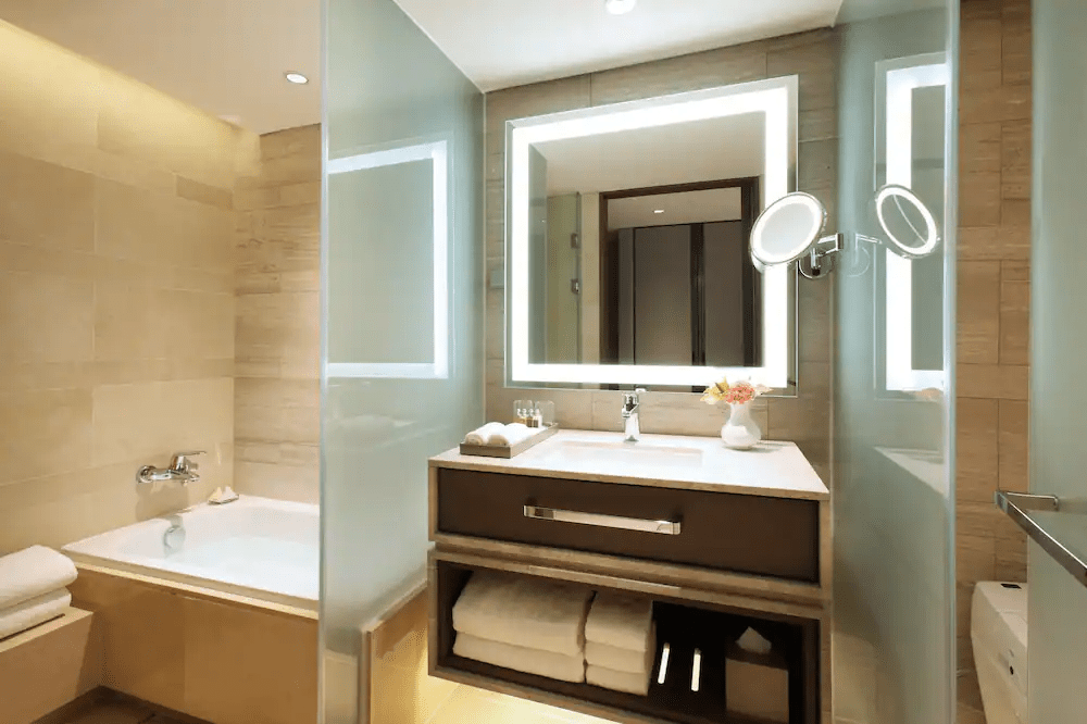 분리형 욕실 구조로 동시에 두 사람이 이용하기 좋아요. 어메니티로는 샴푸와 컨디셔너, 바디워시, 바디로션, 비누가 제공됩니다. 이와 함께, 수건 3종과 목욕 가운, 샤워캡, 빗, 면봉, 헤어드라이어가 있습니다.