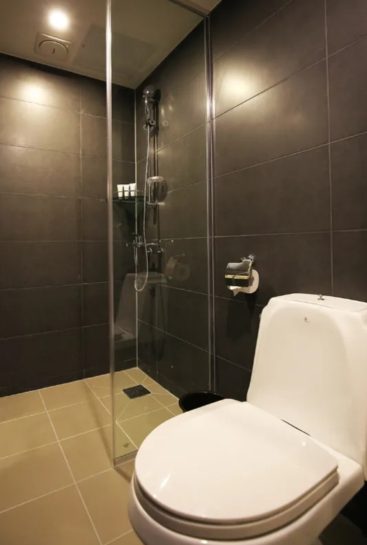 욕실에는 샤워부스가 설치되어 있고, 세면대는 분리된 구조로 효율적으로 사용하기 좋다. 욕실 어메니티로는 샴푸, 린스, 바디워시, 바디로션, 샤워캡, 헤어드라이어, 코튼 세트, 머리빗, 수건 등이 준비돼 있다. 개별적으로 칫솔과 치약, 클렌징 폼 정도만 챙겨 오면 된다.