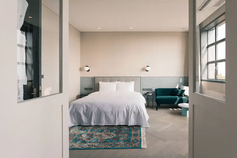 화이트의 깔끔한 건물로 구성된 숙소는 멀리서 보면 평범한 호텔처럼 보인다. 가까이서 보면 하나의 마을처럼 꾸며 놨는데, 여기에 브릭과 인더스트리얼 인테리어로 젊고 활기찬 분위기를 연출했다.
