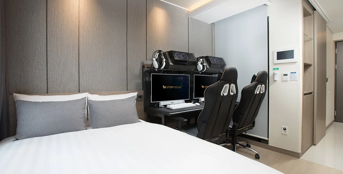 유탑 부티크 호텔은 일반 객실 외에도 파티룸, 온돌룸 등이 준비돼 있다. U-PLAY2 객실은 PC가 설치돼 있어 재택근무나, 게임을 하며 즐거운 시간을 보내기 좋은 곳이다. 스마트 TV도 있어 넷플릭스나 유튜브 같은 스트리밍 서비스를 이용할 수 있다. 미니바도 무료로 제공된다. 간이 주방과 세탁기도 있어 장기 숙박도 문제없다.