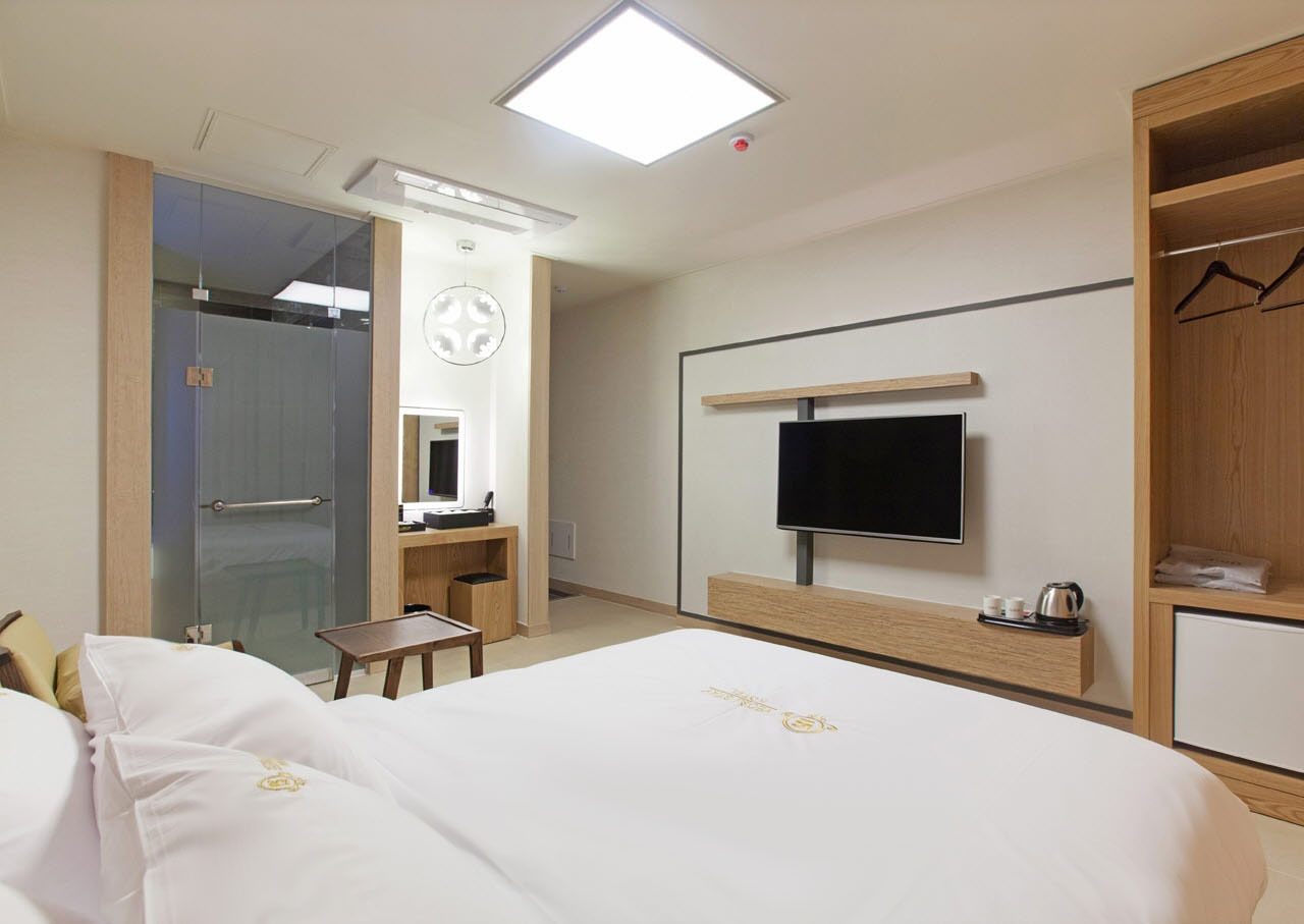 디럭스 더블룸은 원룸형으로 이루어진 객실로 퀸 사이즈 침대와 TV, 작은 테이블과 소파, 화장대, 미니 냉장고까지 알차게 준비돼 있고, 꽤 넓게 구성되어 있는 편이라 커플 여행을 위해 제격이다. 무엇보다 합리적인 가성비로 오션뷰를 감상할 수 있다는 점이다.