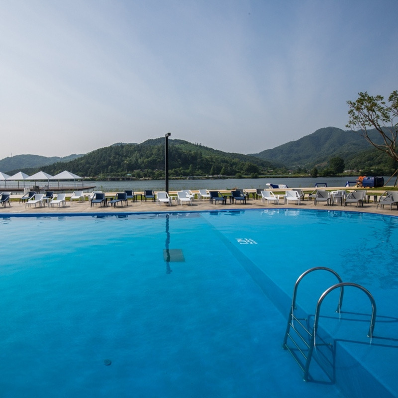 가평 숙소 파로티아 워터하우스 중심에 위치한 수영장은 청평호를 눈에 담을 수 있는 휴식 공간으로 18m * 10m 인피니티 풀과 선베드, 자쿠지 등 편안한 휴식 공간을 갖추어 인기 높다.